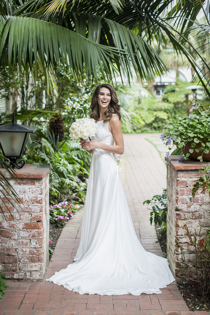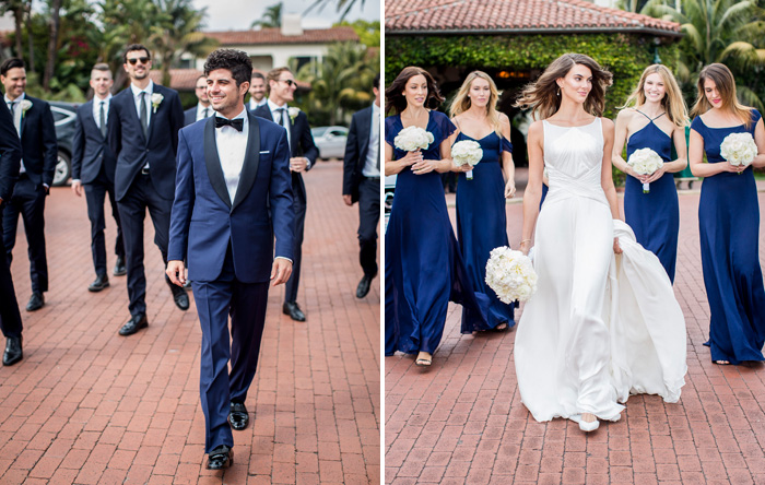Veronica and Jonathan chose the elegant and classic Santa Barbara Four Seasons Biltmore to host their wedding day. Veronica chose a sleek dress by Oday Shakar featuring a boat neckline, gathered waist, and flowing skirt. For her ‘maids elegant navy dresses set off simple white bouquets by Santa Barbara Style.
