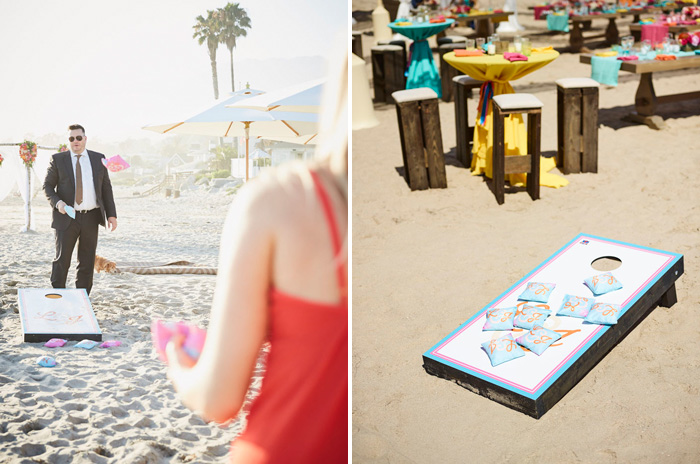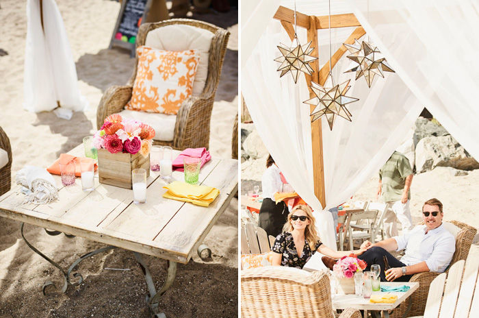 Afterwards, guests enjoyed games and cocktails on the beach and deck. In lieu of a formal sit-down dinner, guests enjoyed tacos by 3 Girls Catering and lounged in an eclectic mix of seating from Town and Country Event Rentals, including, lounge cabanas, long wood tables and cocktail tables. String lighting, star lanterns and white chiffon by Bella Vista Designs set the mood. And finally, the wedding cake, made by a close friend, was decorated with gerber daisies, roses, and mums.
