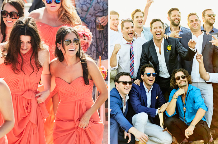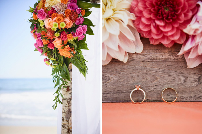 As guests entered the beach ceremony, a display of colorful flips flops encouraged guest to lose their shoes and get beach chic. Down the aisle, colorful pomanders led up to a birch arbor with bright, tropical, floral accents.