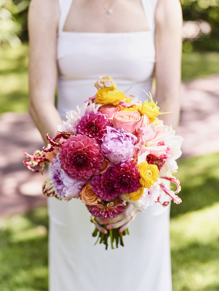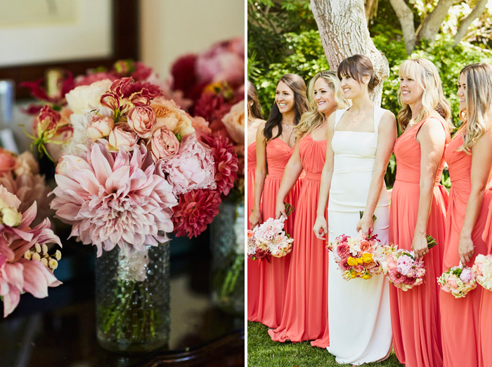We had so much fun planning this true Santa Barbara beach wedding. Lauren and Jon chose to have their wedding at her family beach house and picked a bright and cheery fiesta palette of oranges, yellow, pinks and turquoise. The bride carried a bouquet made up of dahlias, peonies and ranunculus by Hogue and Co.