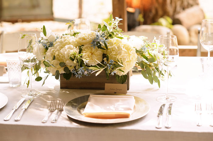 On the bluffs overlooking the beach at Dos Pueblos Ranch, Missy and Matt said “I do” under a beautiful chuppah with white garden roses and soft blue hydrangea by Camellia Floral Design. The bride donned an elegant lace dress and her bridesmaids wore dark, emerald green dresses. The barn, just a few steps from the beach, hosted the reception. Long tables were decorated with a mix of bud vases and footed silver trays as well as larger floral centerpieces. Elegant chandeliers from Ambient Event Design added a hint of glamour to the space. For dessert, the couple opted for a selection of mini cupcakes from the always tasty, Enjoy Cupcakes.