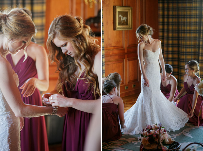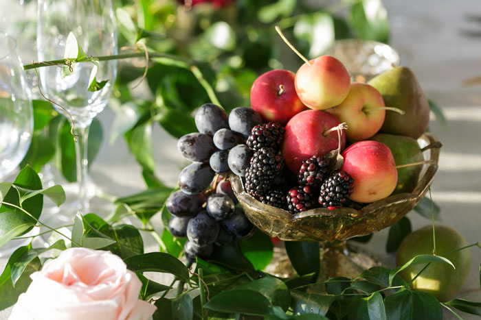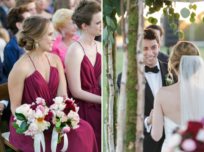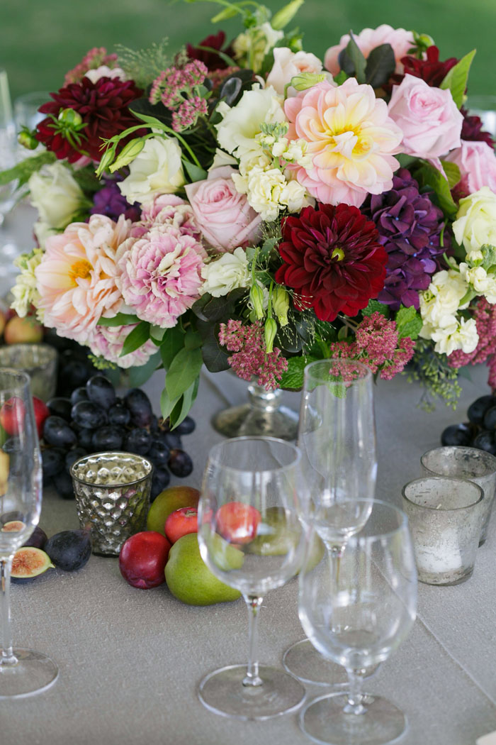 Kristen and Andrew hosted a traditional Jewish ceremony on the beautiful lawns of the Bella Vista Ranch. The chuppah was decorated simply with greenery by Hogue & Co and the bride walked down the aisle in a classic lace trumpet wedding dress. At the entrance of the reception, an arch of greenery welcomed guests into the elegant reception tent and at night the arch lit up with hundreds of twinkly lights. The neutral farmhouse tables were accented with flowers in a palette of deep burgundies, rust, and light pink mixed with compotes of figs, grapes and crab apples.