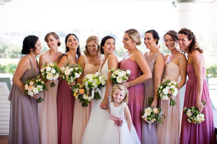 One of my favorite wedding locations ever (long, ago I managed the property) is Crossroads Estate in Santa Ynez. This bride got ready in the historic craftsman house on the property, and donned a delicate lace and tulle wedding dress by Vera Wang. The bridesmaids wore long flowing dresses in shades of pink and mauve and carried garden bouquets by Hogue and Co. Leslie and Scott said I do with the dramatic Two Oaks of Crossroads as the backdrop. For dinner, long feasting tables mixed with round tables were decorated with lush green and white florals. Smilax vine trailed down the center of the tables making an airy garland. Cake and cupcakes were made by the always delicious, Enjoy Cupcakes.
