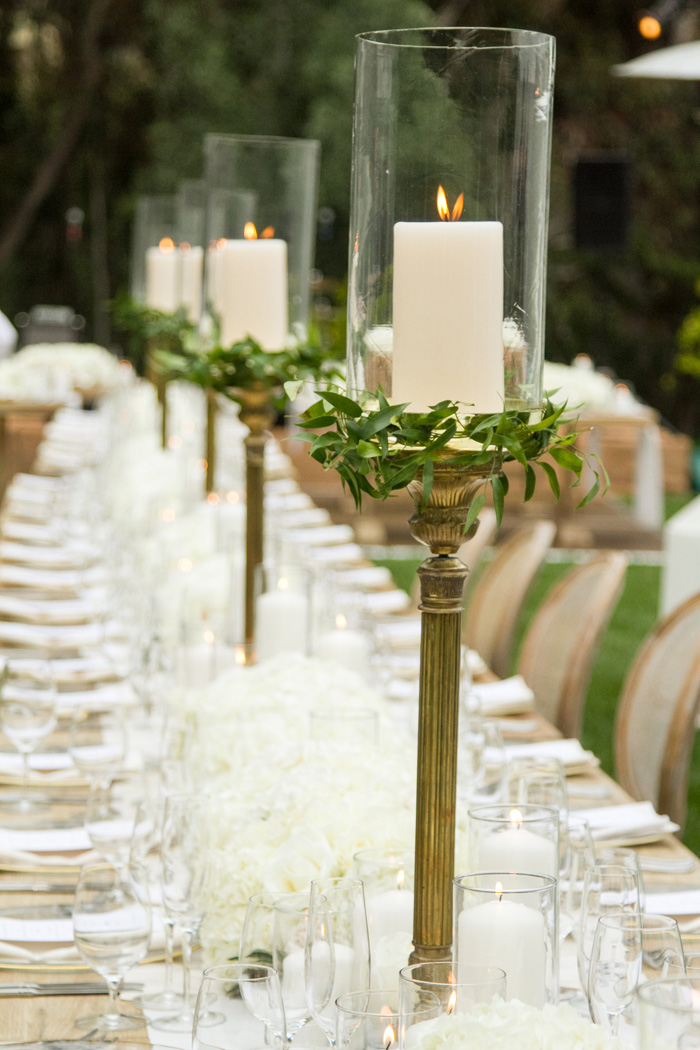 Kjuen and Scott’s modern white and cream wedding was held at San Ysidro Ranch’s elegant upper lawn. The bridesmaids donned cream dresses to go with the theme and carried white bouquets. The ranch’s arbor on the upper lawn was decorated with lush white roses and hydrangea by the floral designer, Toast. For dinner, long wood tables were set with long, and low, white centerpieces mixed with tall candle holders decorated with sprigs of greenery. A round bar featured a large orchid tree and a variety of colorful glasses.